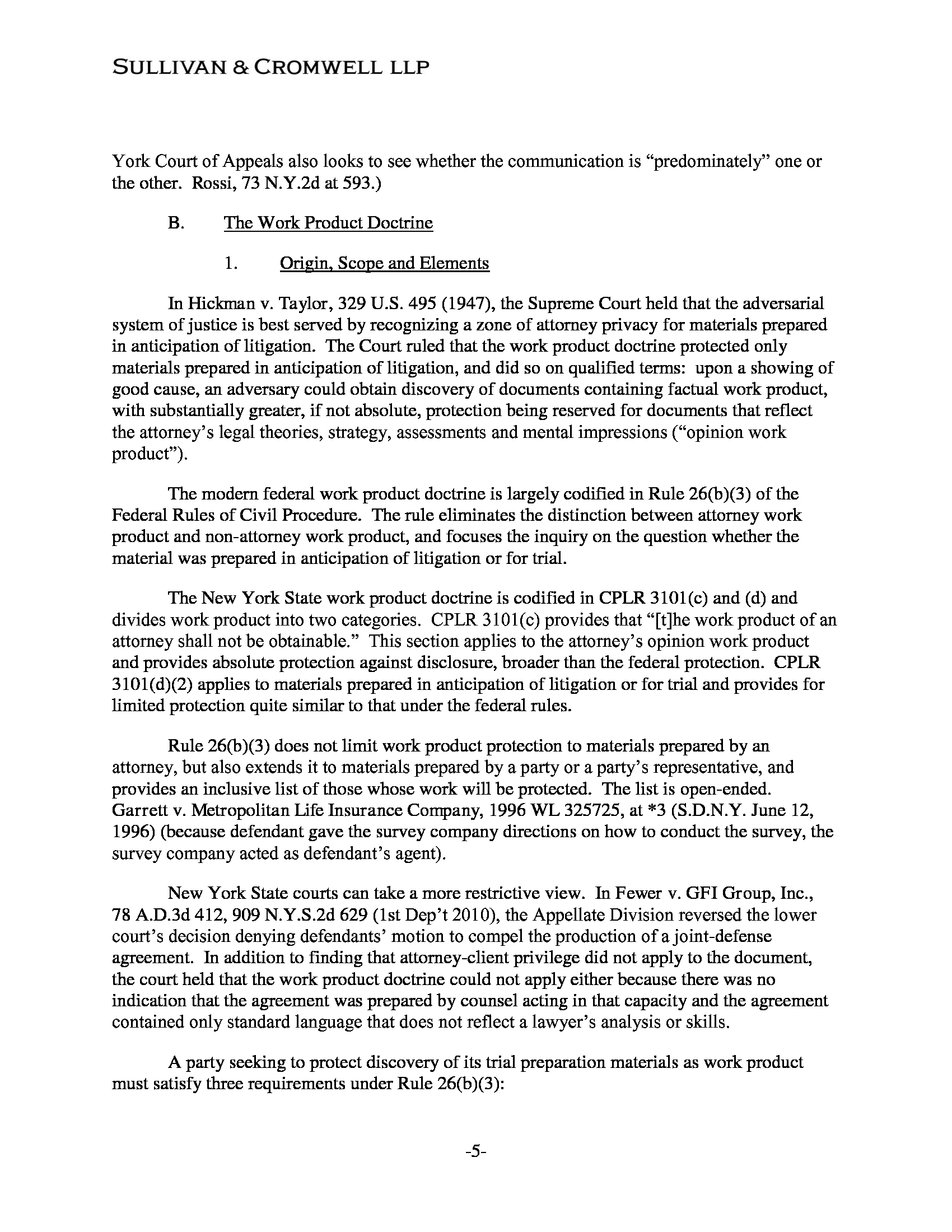 Protection codified in Rule 26 of the Federal Rules of Civil Procedure preventing a party from being required to disclose materials in discovery that were. The work product doctrine a discovery rule recognized by the US. The case law that has arisen around both the.